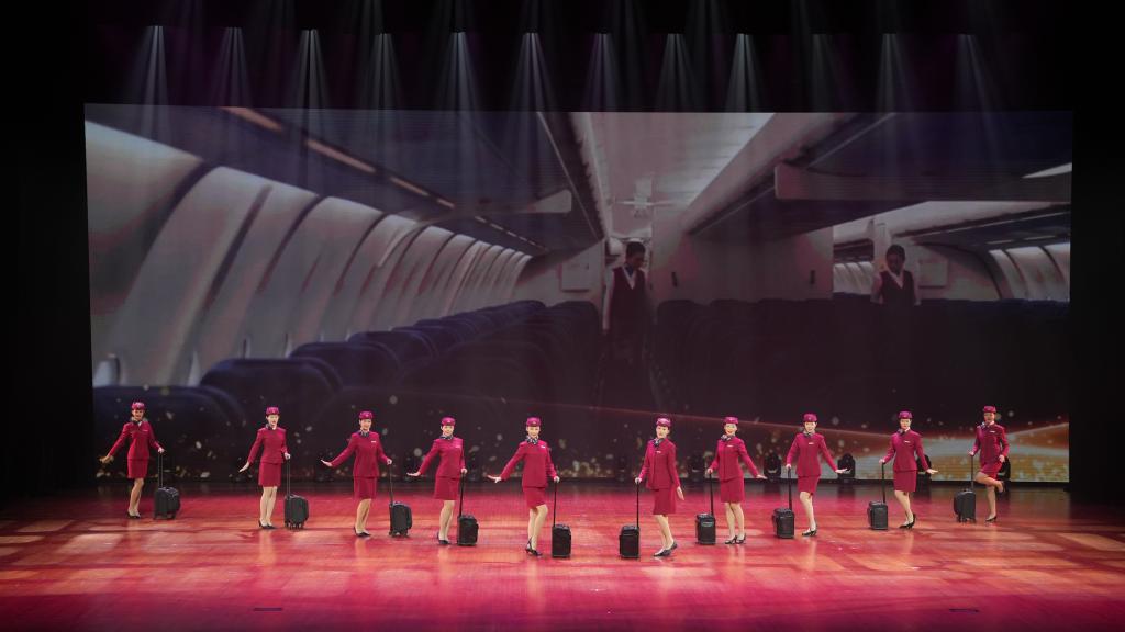 舞台光影流转,时空在此切换。时尚表演《时·溯》通过流动的剪影与节奏鲜明的音乐,展现服饰背后的审美变迁与时代精神;空乘礼仪表演《云端·悦行》则以规范的动作与从容的姿态,演绎出服务艺术中的专业风范。学前教育专业带来情景表演《稚童年》,纯真童趣的肢体语言与互动编排,传递出教育的温度与艺术的启蒙力量;台词教学情景表演《玩转元素》运用“幕后千百遍”与“台前一方台”的对比,凸显了影视系学子厚积薄发的专业精神。