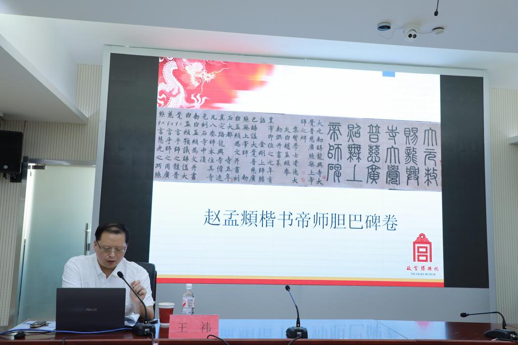王祎研究员以《元碑不出吴兴外——赵孟頫书碑浅说》为题,从元代的书碑入手,系统梳理了赵孟頫书碑相关的文献著录、碑铭拓本、传世墨迹。讲座介绍了赵孟頫以第四等的南人身份位居一品,“荣际五朝,名满四海”,成为元代著名文学家、书法家和画家的一生,同时结合近百种碑刻拓本和墨迹实例,详细阐释了赵孟頫不同阶段书法艺术发展特点及风格。王祎研究员强调:“孟頫篆、籀、分、隶、真、行、草书,无不冠绝古今,遂以书名天下。其书法艺术风格根据传世作品大概又可分为四个时期,这四个时期书法艺术或字势挺拔,庄重大气,法度谨严,或庄严规整中见潇洒飘逸。”