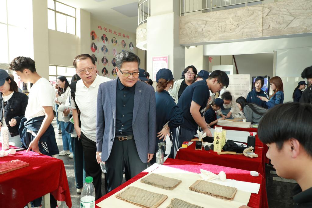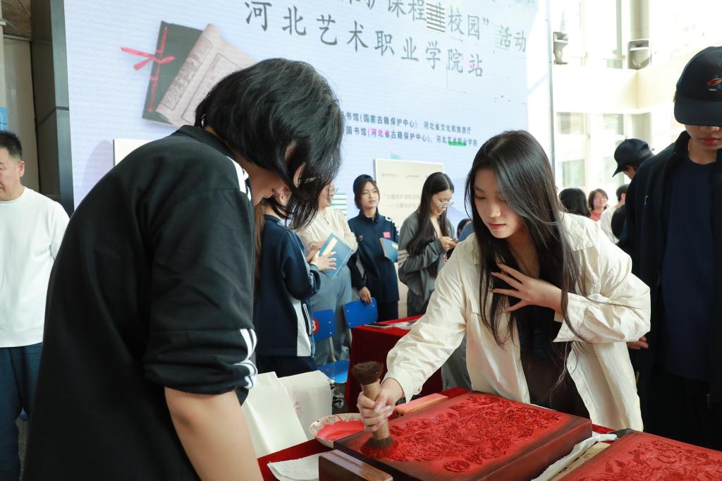 讲座结束后,河北省图书馆与河北艺术职业学院文物修复与保护专业组织了古籍修复、传拓等技艺观摩体验活动。与会嘉宾及师生代表积极参与了现场体验:在雕版印刷体验区亲手印刷,感受古老技艺;在线装古籍装帧体验区穿针引线,学习传统书籍装帧制作;在古籍修复技艺展演前驻足细览,零距离感受古籍修复的魅力。
