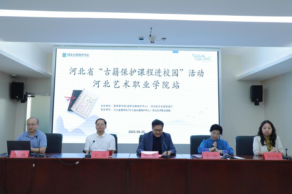 9月25日,河北省2025年度“古籍保护课程进校园”系列活动在河北艺术职业学院举办。本次活动由国家古籍保护中心、河北省文化和旅游厅主办,河北艺术职业学院、河北省图书馆共同承办。活动邀请故宫博物院研究馆员、书画部副主任兼碑帖组组长王祎作专题报告,河北省图书馆馆长刘栋、副馆长冯宝秀在启动仪式上致辞。河北艺术职业学院副院长金暄,河北省图书馆、石家庄市博物馆、河北师范大学等单位代表及河北艺术职业学院师生共计200余人参加活动。活动现场还组织了古籍修复、雕版印刷等观摩体验活动。