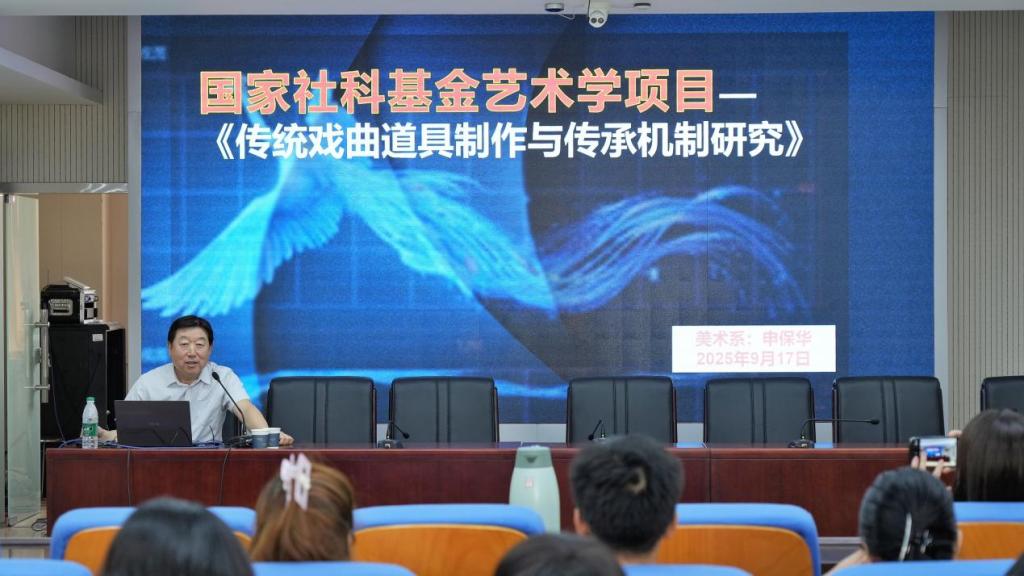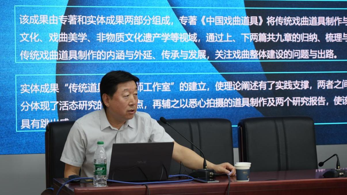 讲座中,申保华老师围绕《传统戏曲道具制作与传承机制研究》项目,从选题策略、研究内容设计、创新点挖掘等核心维度展开分享。他详细介绍了项目如何立足传统戏曲道具“民族性、本土性”特征,将研究置于戏曲文化、戏曲美学、非物质文化遗产学等多学科视域,通过“理论专著+实体成果”双轨并行的研究模式,系统梳理传统戏曲道具的制作工艺、艺术功能与传承脉络。其中,“传统道具技能大师工作室” 的实体建设经验尤为亮眼,该工作室以“保护、传承、拓展、创新”为核心理念,不仅为理论研究提供了实践支撑,更探索出“校企共建、剧目导入、实境育人” 的工匠型人才培养路径,相关成果曾获河北省教学成果奖二等奖。