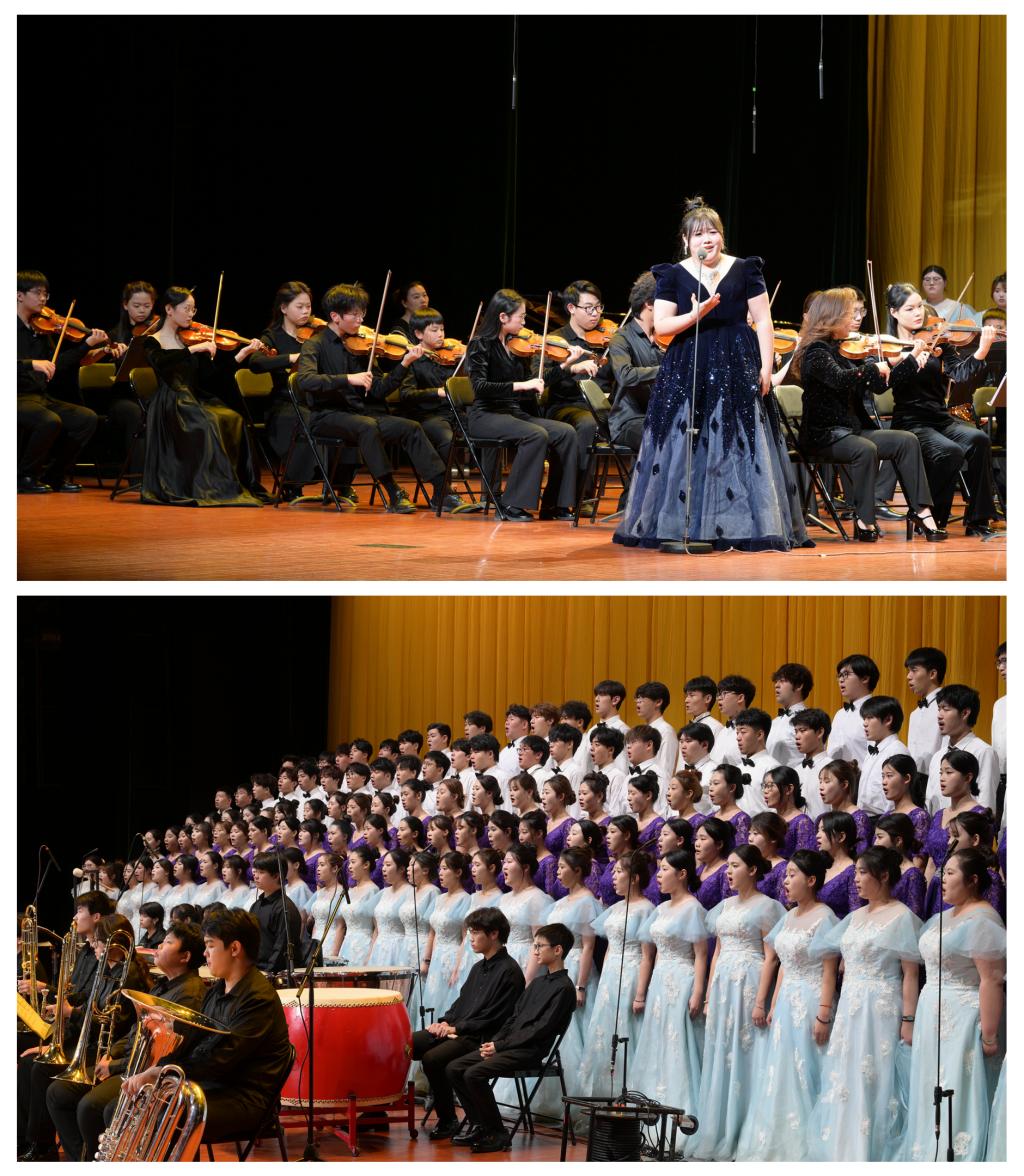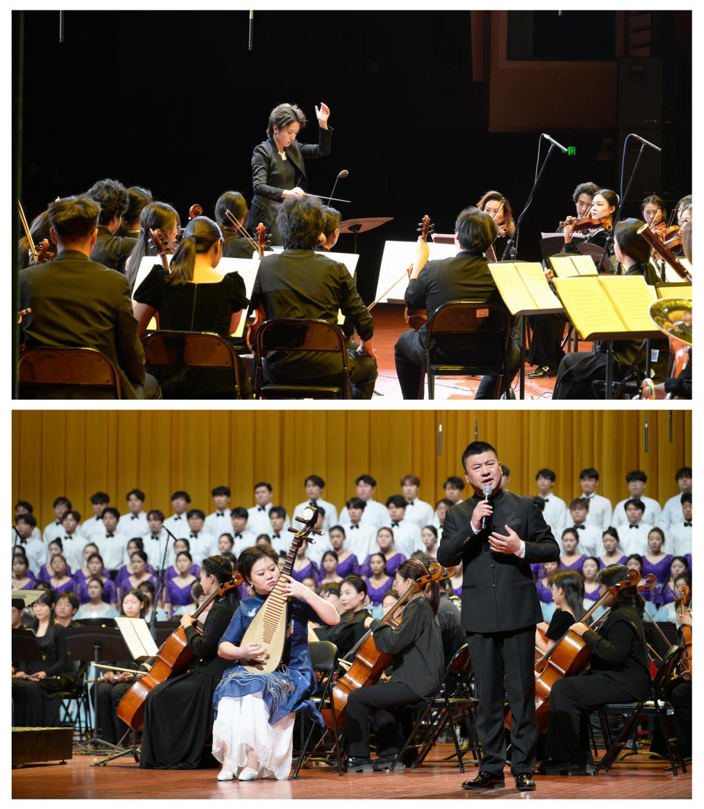 压轴巨献《黄河大合唱》由三校乐团联袂演出,在中国音乐学院青年教师谭喜露的指挥下,河北艺术职业学院校友陈文胜、中国音乐学院研究生邱佳裕、河北艺术职业学院在校生鲁佳怡与三校师生以饱满激情再现了这部镌刻民族气节的不朽史诗,将现场气氛推向高潮。其中配乐朗诵《黄河之水天上来》激昂澎湃又深沉凝重,女声独唱《黄河怨》悲痛哀怨而如怨如诉,让观众仿佛置身于抗日战争的烽火岁月,感受到了中华儿女保卫祖国、抵御外敌的坚定信念。合唱《黄水谣》细腻而深情,如同黄河的潺潺流水,诉说着中华民族的历史故事;合唱《怒吼吧!黄河》主调与复调相结合,以慷慨悲歌的旋律气吞山河,展现出中华民族在艰难困苦中奋勇前行的决心。