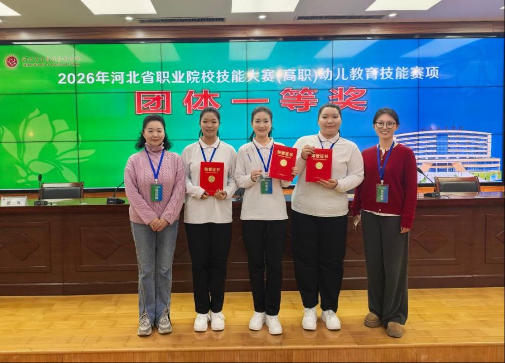 2025年12月27日至28日,河北艺术职业学院由艺术教育系王梦瑶、薛梦晗、谷佳怡三位同学组成的代表队,在索娅敏、马凤辗两位教师带领下参加2026年河北省职业院校技能大赛(高职)幼儿教育技能赛项并荣获团体一等奖。