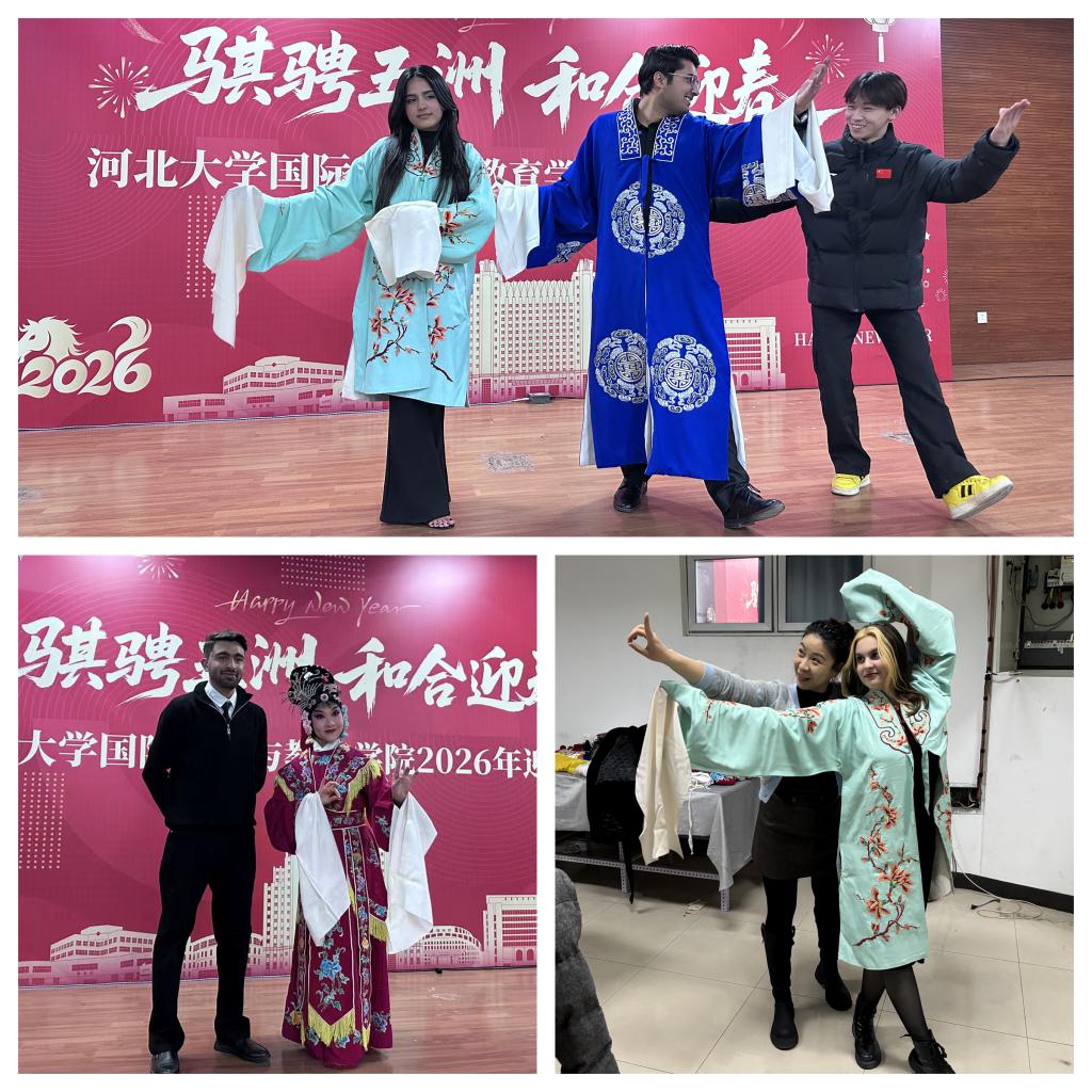 为积极推动戏曲艺术的国际传播,深化校际文化交流,展示学院戏曲专业办学特色,应河北大学国际交流与教育学院邀请,2025年12月30日,我院社会教育部、戏剧系师生参加该校2026年留学生新年晚会,开展了内容丰富、形式生动的戏曲文化展示与交流活动。