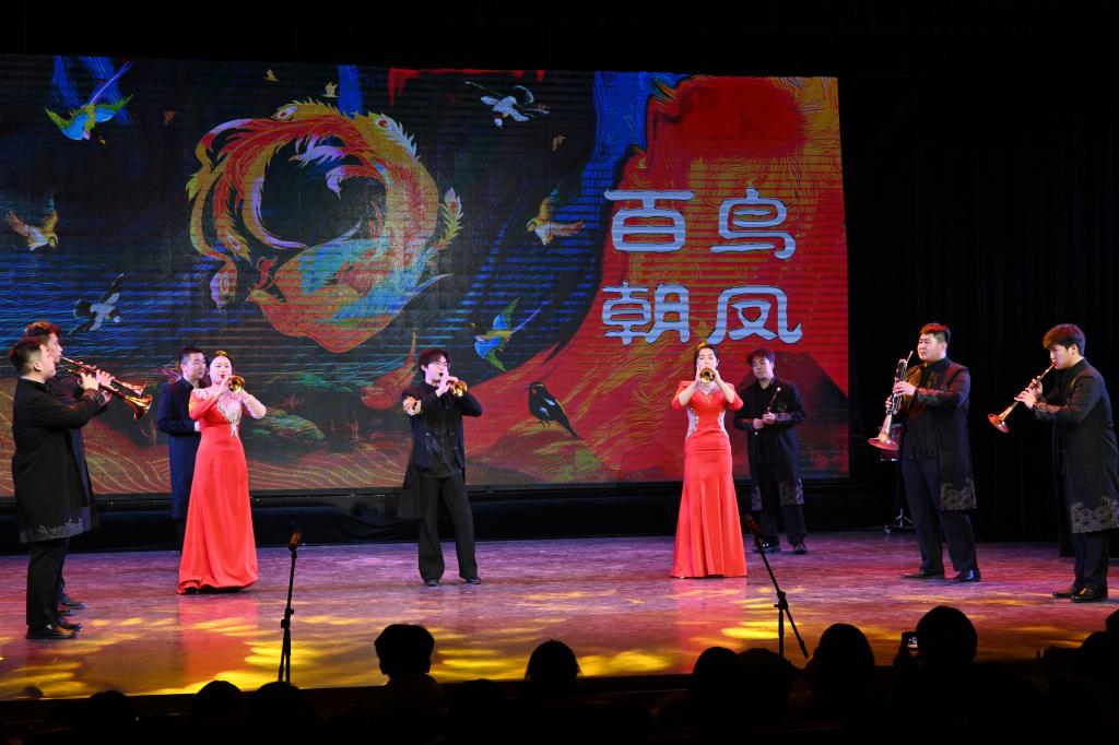 音乐会的后半部分高潮迭起。唐山花吹团队带来《冬来尾》《乡情乡韵》,河间吹歌团队献上《打枣》《欢乐的农村》,两支队伍以令人目眩的“花吹”“咔戏”技巧,充分展现了河北吹歌艺术活泼热烈、技艺交融的民间生命力。河艺吹歌艺术团复排的《小二番》《淘金令》的余音未了,忽以幽默夸张的国潮酷炫造型吹奏起中国民族音乐的灵魂之作《百鸟朝凤》。全体演员随即应声走上舞台,老一辈艺术家气韵沉雄,年轻一代学子们精神抖擞,两代人的吹歌声交织应和,宛若一场跨越时空的对话——百鸟鸣啭间,既有深厚传统的精粹流转,更有新生力量的清亮回响。当最后一声高亢的尾音响彻剧场,掌声如潮,这不仅是向经典的致敬,更是非遗艺术薪火相传、生机勃勃的最动人写照。