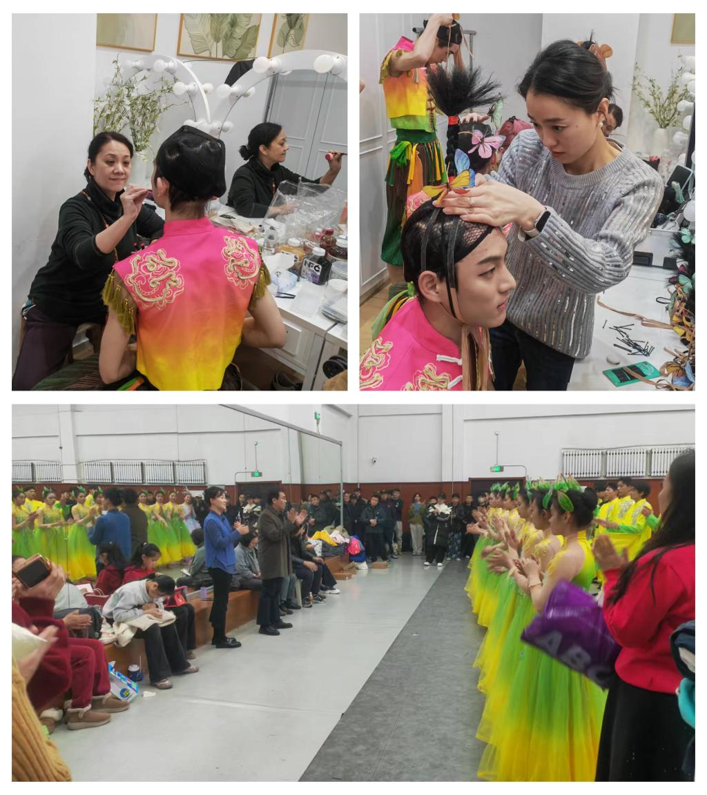 本次参演由舞蹈系主任杨绯担任总领队,教师张峥、潘登担任节目编导,教师杨丽、郭晓晶全程负责学生管理工作。为呈现最佳舞台效果,参演师生开展了高强度的排练,时值寒假,大家放弃休息时间,从清晨到深夜,反复打磨每一个舞蹈动作,精准抠细节、细练配合度,对队形编排、情感表达、舞台走位进行一遍又一遍的优化。面对不同节目迥异的风格要求,同学们积极克服体能消耗大、动作难度高的困难,始终以高标准完成每一次排练。编导与管理老师全程陪伴,悉心指导动作要领、及时调整学生精神状态,保障排练高效推进。同学们在与省级专业院团演员的排练磨合中,快速吸收舞台表演经验,专业素养与舞台表现力获得显著提升。河艺师生的出色表现赢得了导演组的高度认可,多次称赞同学们排练认真刻苦、领悟能力强、舞台表现亮眼。