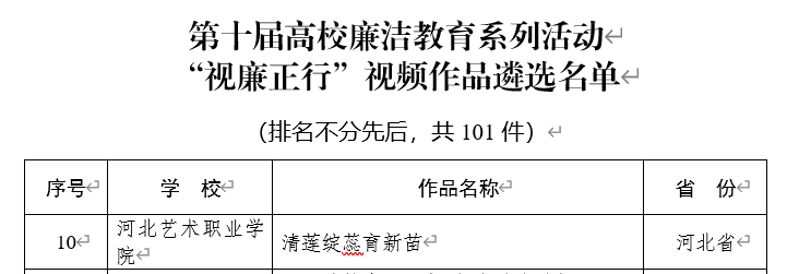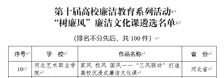其中,戏剧系选送的《清莲绽蕊育新苗》入选“视廉正行”视频作品遴选名单,思政教学部选送的《家风 校风 国风——“三风联动”打造高校沉浸式廉洁文化课》入选“树廉风”廉洁文化课遴选名单。