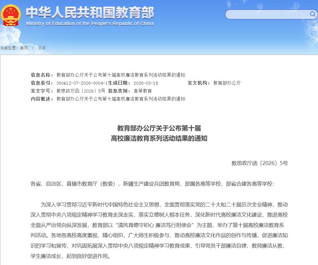 第十届高校廉洁教育系列活动以“清风育德守初心,廉洁笃行担使命”为主题,面向全国开展校园征文、视频作品等7大类别遴选。经层层筛选和教育部专家综合评审,全国最终产生优秀作品844件。此次获奖是学院深入贯彻落实立德树人根本任务、深耕校园廉洁文化建设的生动体现。