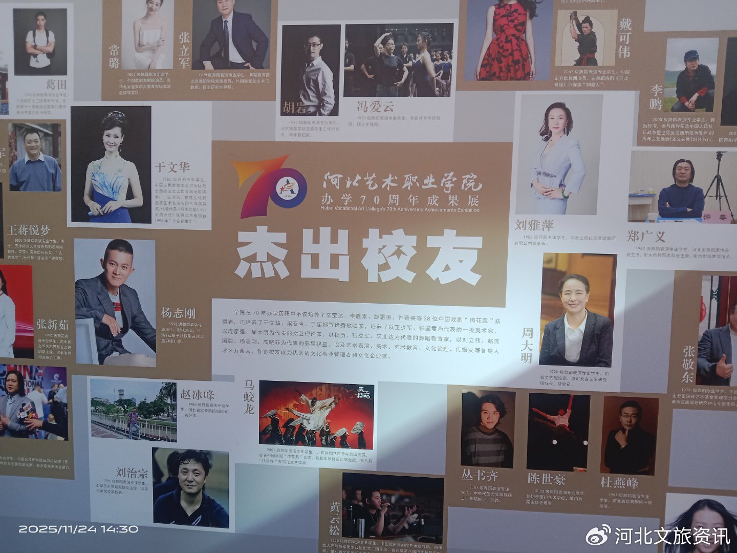 11 月 24 日,河北艺术职业学院办学70周年成果展、综合汇报演出等系列活动陆续启幕,展历史规律、演艺术精神、聚发展力量,河艺师生用一场内容丰富、形式多样的成果展演,向母校七十华诞献上诚挚的祝福。
