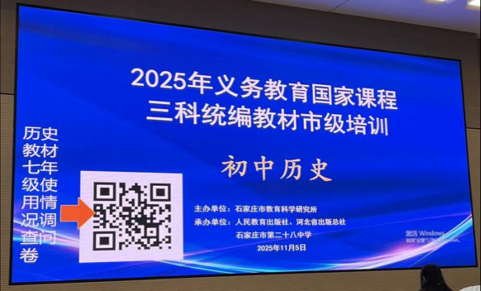 2025年11月5日,“2025年义务教育国家课程三科统编教材市级培训(初中历史)”在石家庄市第二十八中学举行,史地教研室王媚老师参加了此次培训。本次培训由石家庄市教育科学研究所主办,人民教育出版社、河北省出版总社承办。培训内容围绕初中历史统编教材的教学与备考展开,旨在帮助教师更好地理解教材编写理念,提升课堂教学质量,增强学生历史学科核心素养。