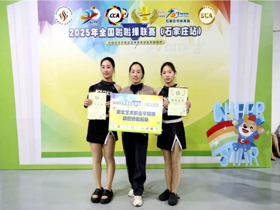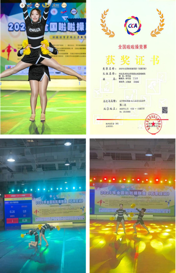 11月29日,2025年全国啦啦操联赛在石家庄国际博览中心举行,河北艺术职业学院学子取得女子双人花球自编套路第2名的好成绩。