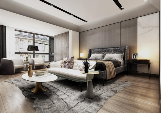 卧室的背景墙采用亚麻材质,和大理石纹路壁纸搭配,产生一种禅意,使人心静,更利于休息。卧室空间比较大所以我用沙发坐了空间分割,为业主提供更私密的家庭生活小空间,在卧室勾勒出一个更私密的不被人打扰的小客厅。