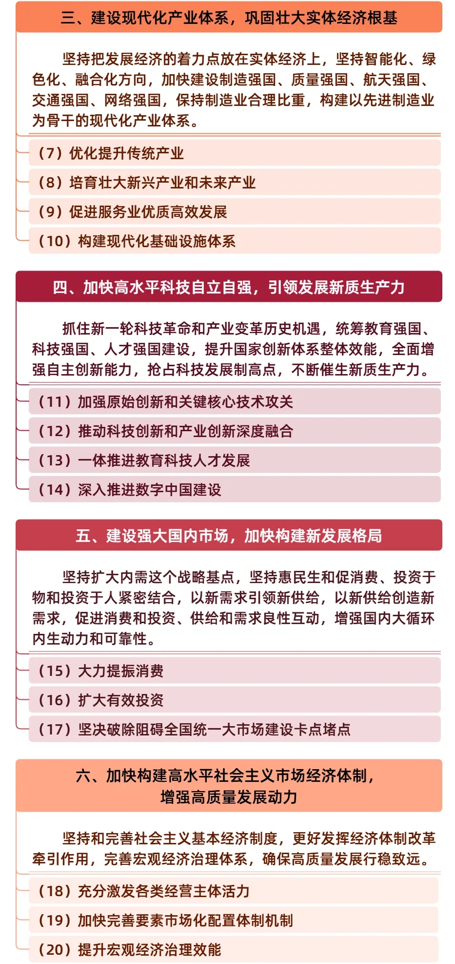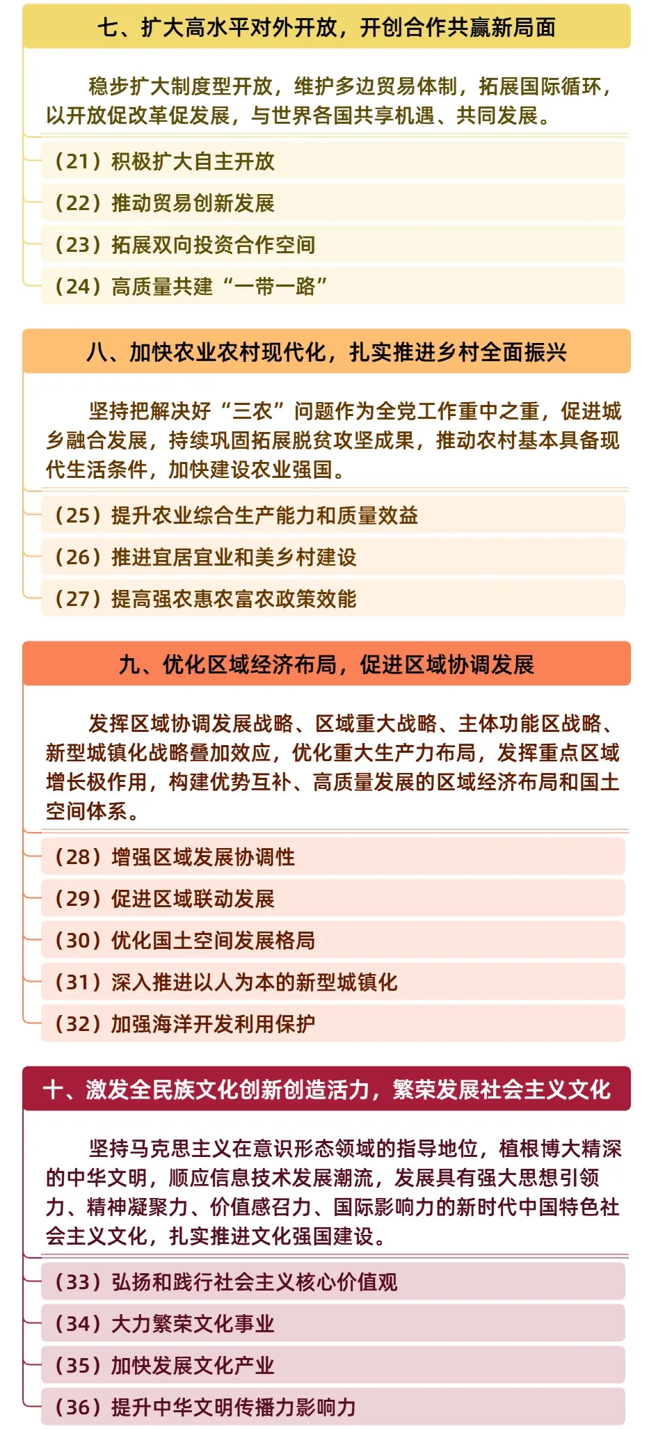 第二板块包括第三至第十四12个部分,为分论,主要瞄准关系全局和长远的重点问题,分领域部署“十五五”时期的战略任务和重大举措,明确从产业发展、科技创新、国内市场、经济体制、对外开放、乡村振兴、区域发展,到文化建设、民生保障、绿色发展、安全发展、国防建设等重点领域的思路和重点工作。