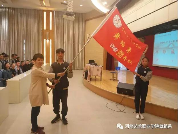 仪式通过视频播放,让学生们看到河艺历史,让学生们珍惜现在的学习生活。张学红书记通过两个故事引出讲话内容,勉励学生尊师重教,亦希望教师们在传道授业解惑中诲人不倦,传承和发扬河艺舞者精神。杨绯主任给学生们讲解拜师礼的重要意义,并为2018级命名“翾舞级”。中国舞专业教师杨丽,15级小舞许葭颀,18级王茜分别代表教师和学生发言。随后,学生代表分别为自己的恩师敬茶以示对恩师的谢意。全体同学带着自己最初的梦想,怀着敬畏之情向授课教师行李鞠躬。“告别童年,告别昨天,我们不再天真烂漫,放飞纯真,放飞理想,让专业和文化扬起生命的风帆”的口号荡漾在每一位“翾舞级”学生的心田。最后,张学红书记郑重将“翾舞级”班旗授予翾舞班全体学生,鼓励学生们争做栋梁之材。至此,2018级新生拜师礼顺利结束。