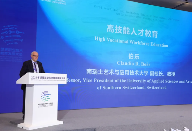 在“高技能人才培养的院校实践”议题中,南瑞士艺术与应用技术大学副校长、教授伯乐(Claudio R. Boër)教授就“高技能人才教育”,重庆医药高等专科学校副校长兰作平就“实施多维多边合作 共育‘一带一路’医药卫生急需人才”,新加坡国际智能制造协会主席周伟(Zhou Wei)就“新加坡智能制造与高技能人才培养”,青海职业技术大学校长霍雄飞就“东西部协作培养高技能人才,教育援青机制探索”,德国施韦比施格明德师范大学教授约瑟夫·古格莫斯(Josef Guggemos)就“德国职业教育的最新发展:数字化整合与渗透性”,兰州资源环境职业技术大学党委副书记、校长谢军武就“深化‘三项改革’,着力培养本科层次高技能人才”,柬华应用科技大学柬方校长钟耀辉(SOK HUY)就“柬华应用科技大学建设,促进柬埔寨职业本科体系发展”,天津电子信息职业技术学院校长张丹阳就“推进数字化转型,重塑职业院校新形态的创新与实践”,俄罗斯弗拉基米尔国立大学副校长潘菲洛夫·阿列克谢(Aleksei Panfilov)就“俄罗斯职业教育质量监测与评价:培养高技能人才”,常州机电职业技术学院党委书记沈琳就“从‘伴企出海’到‘随园建院’—‘郑和学院’国际合作的创新与实践”,作主旨发言。该环节由天津商务职业学院党委书记马雷主持。
