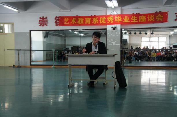 肖鑫锋同学会弹奏12种乐器,目前被沧州外国语学校录用为音乐教师,在找工作的过程他中凭借自己过硬的本领打败了众多的本科生。他主要讲述了自己这三年来的学习感悟,给学弟学妹们加油打气,并不是专科毕业的学生就找不到好工作,关键还是要自己把专业学好、学精,要舍得去付出才会有收获。